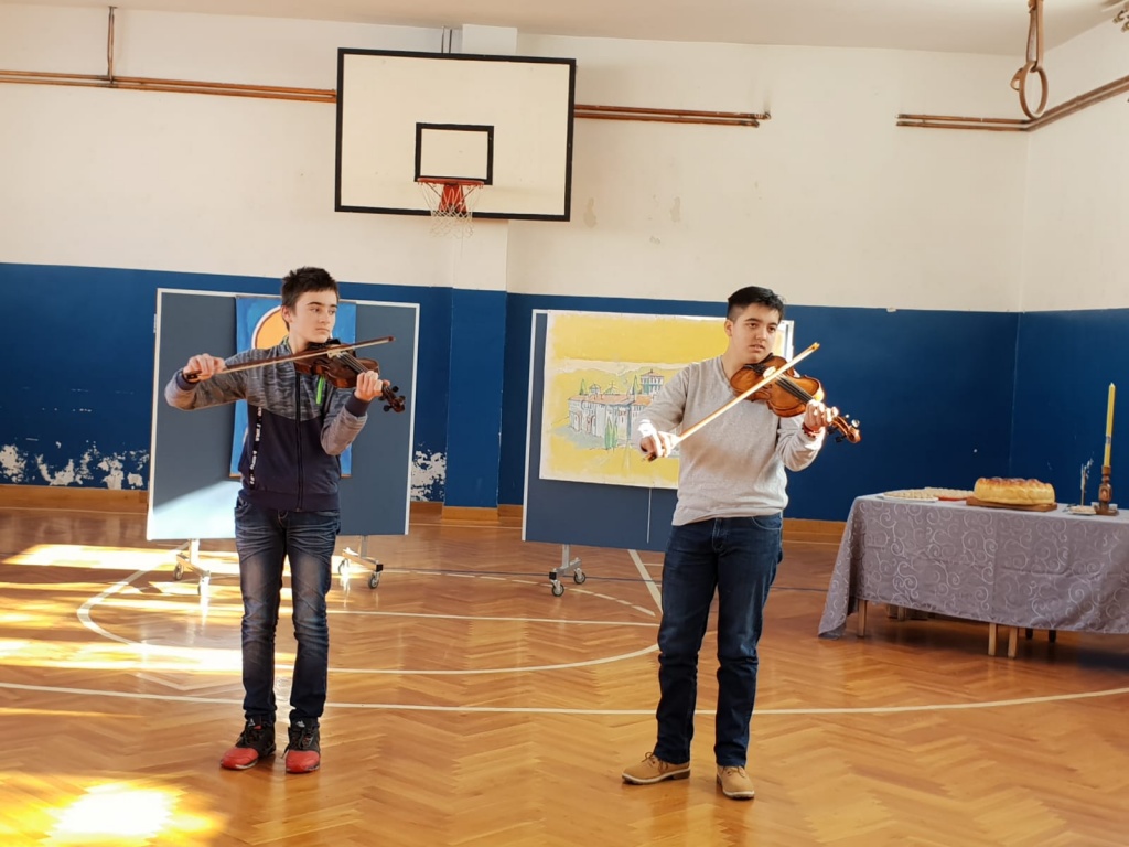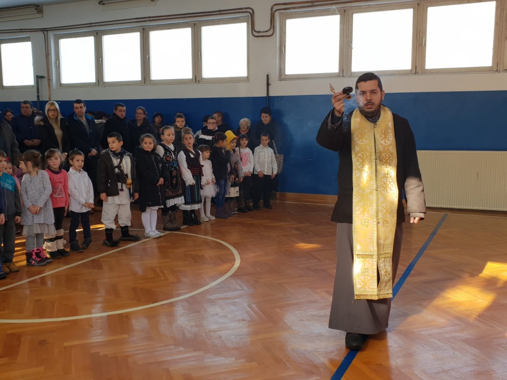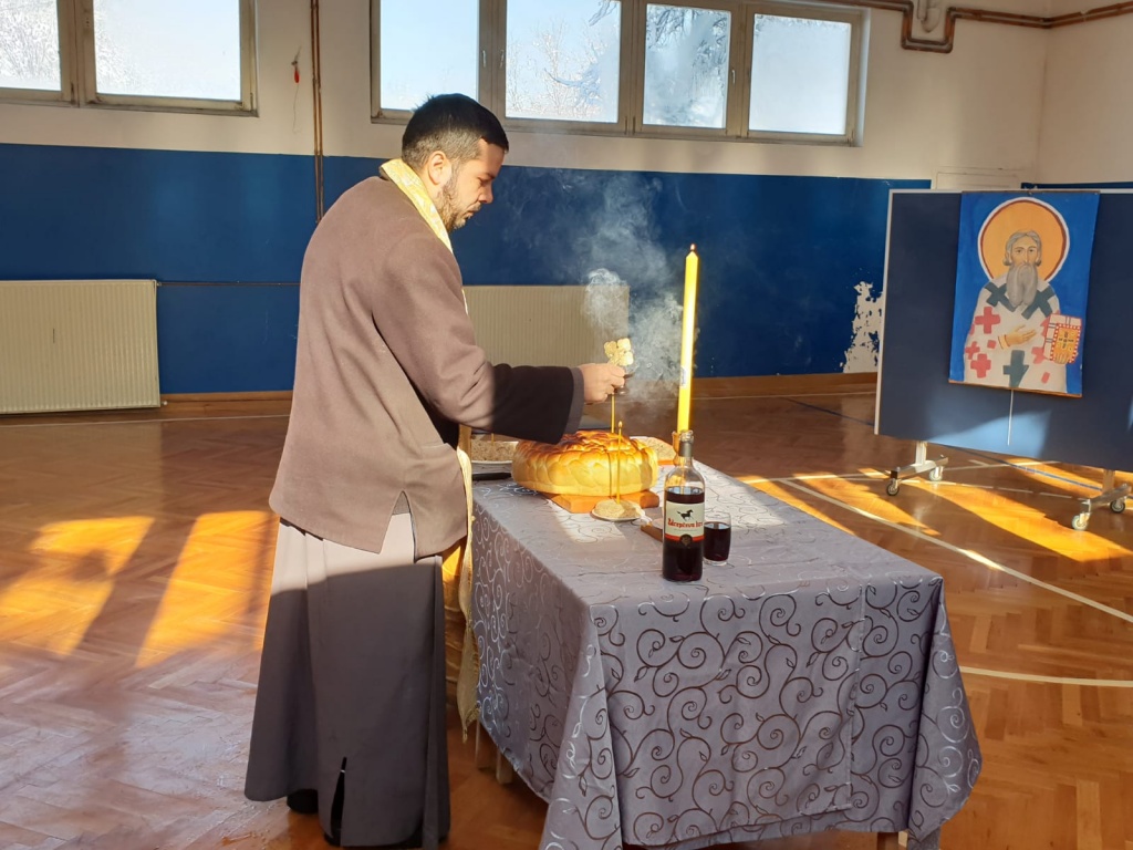 Након приредбе свештеник Душан је, заједно са овогодишњим колачарима - породицом Дурузић, свечано пререзао славски колач и свим ученицима и запосленима честитао славу.
